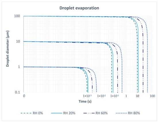 For the validation of our numerical model, the evaporation of a single droplet over time was numerically simulated. Three different diameters were evaluated: 1 µm, 10 µm, and 100 µm. The temperature of the environment and the droplet were Te = 293.15 K and Td = 310.15 K, respectively. Figure 1 shows the results with four different relative humidity ratios (0%, 20%, 60%, and 80%), the same method used by Redow et al. [5], Mowraska et al. [8], and Li et al. [13].