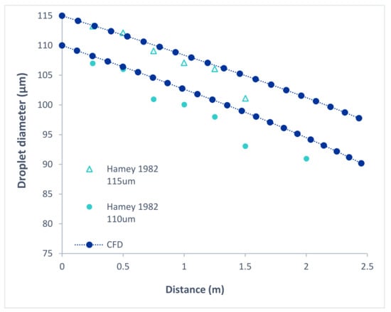 In addition, the study of Hamey [25] was used to validate the distance that a single droplet can traverse. The study consisted of a free fall water droplet into a wet space of relative humidity RH = 70%, Te = 293 K, and Td = 289 K, and droplet dimeter of 110 µm or 115 µm, as shown in Figure 2.