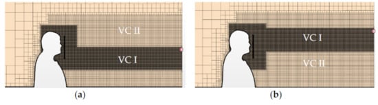 The discretization of the computational domain was made by means of a trimmer mesh. The domain was composed of 6.7 × 106 (6,755,678) cells. The most important zone of this study was the face shield, where the droplets were expected to impact, therefore, a finer mesh was made near it using a volume control (VC). The same volume control was also used in the direction of sneezing. In addition, a second volume control was used above and below the jet. Figure 5a illustrates the mesh used when the mouths were at the same height and Figure 5b show the meshes used when the difference between the height of the two mouths was 20 cm.