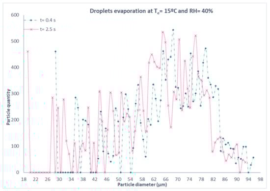In Figure 7, the influence of relative humidity can be observed by comparing RH = 40% and RH = 60%. At the same time, with the same ambient temperature conditions and the same sneeze characteristics, droplets of larger diameter were obtained when the relative humidity was higher. Moreover, it can be concluded that an environment with a less relative humidity results in droplets with a smaller diameter. Furthermore, the lifetime of a droplet in the environment at two different temperatures, Te = 15 °C and Te = 25 °C, was analyzed as shown in Figure 8. The results determined that droplets with a smaller diameter exist when the temperature in the environment is lower.