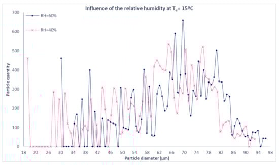 The distribution of the droplets size at t = 2.5 s when the environment temperature was 15 °C. Comparison between RH = 40% and RH = 60%.