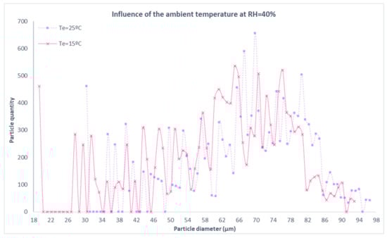 The distribution of the droplets size at t = 2.5 s when the relative humidity was 40%. Comparison between Te = 15 °C and Te = 25 °C.