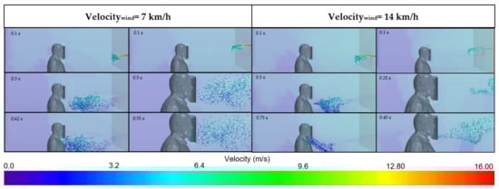 The influence of the wind speed in the transmission of the droplets produced with the sneeze was studied with two scenarios: a soft breeze of 7 km/h and a moderate wind of 14 km/h. The sneeze had a velocity value of 16 m/s. When the human sneezes and after 0.4 s, i.e., the time that the sneeze lasts, the droplets immediately adapt to the wind speed; the same result was obtained by Dbouk et al. [14]. In the case of a soft breeze of 7 km/h, droplets traversed the distance of 1.5 m and reached the other human in 0.62 s. When the mouth was placed with a height difference of 20 cm, the droplets arrived earlier, in 0.55 s, as the face shield was closer. With a moderate wind of 14 km/h, the droplets impacted with the silhouette in 0.75 s was due to the turbulence created between the face of the human and the face shield, producing a swirl of droplets that ended up impacting with the back of the face shield. At a different height, the droplets impacted with the face shield in 0.45 s, because the wind speed was considerately higher. Figure 9 illustrates the difference between each wind speed scenario and mouth height. When there is an external airflow, the droplets reach the other human and, therefore, increase the risk of infection. In this study, due to the human placed at a distance of 1.5 m, there is no option to find out how far these droplets can reach. However, our results are in agreement with studies such as those of Feng et al. [12] and Li et al. [13] among others, where the distance of 6 feet is traversed in a very short time.
