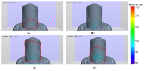 The evolution of the droplets exhaled to the environment was tracked at t = 0.4 s and t = 2.5 s and are shown in Figure 6, with a droplet size ranging from 19 µm to 96 µm diameter. At t = 2.5 s, a maximum droplet size of 92 µm and a minimum droplet size of 19 µm were observed. At t = 0.4 s, in contrast, there were no droplets of 19 µm diameter, but 461 droplets of 29 µm were observed. In that timeframe, the evaporation process takes place, and the 29 µm droplets manage to evaporate down to a diameter of 19 µm.