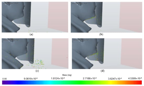 Mass of the droplets entering the face shield at 40% RH and Te = 25 °C. (a) Wind speed of 7 km/h and the mouths at the same height; (b) Wind speed of 14 km/h and the mouths at the same height; (c) Wind speed of 7 km/h and the mouths with a height difference of 20 cm; (d) Wind speed of 14 km/h and the mouths with a height difference of 20 cm.