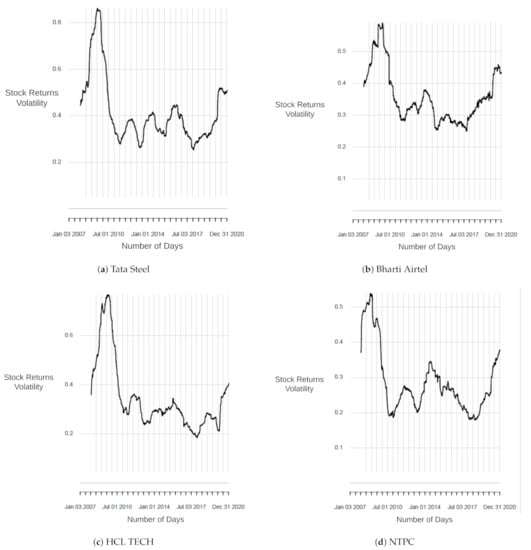 We have considered a few NIFTY 50 stocks, like Tata Steel, Bharti Airtel, HCL Tech, NTPC, and stock indices, like NIFTY 50, Bank Nifty, Nifty 100, and Nifty 500. The datasets were considered from January 2007 to April 2021 (https://www.nseindia.com/, accessed on 17 June 2021).