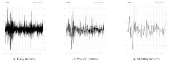 Fakhfekh and Jeribi [] investigated a different type of GARCH models for volatility estimation. The work considered student-t and normal error distribution in the GARCH model. AIC and BIC information criteria were considered to evaluate the model. The performance of the EGARCH model was better than other models. CoinMarketCap data from August 2017 to December 2018 were used to carry out the experiments.