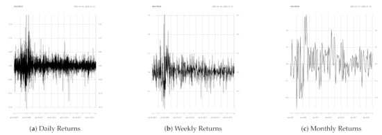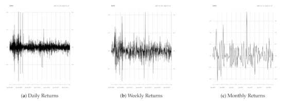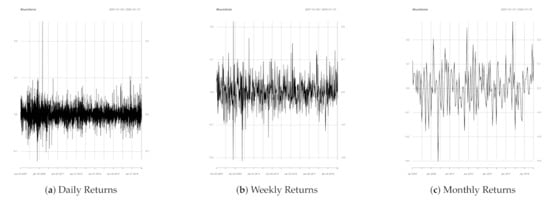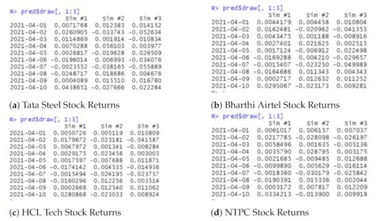 The stock returns are computed using the stock closing price. Let is the closing price of stock at time t, and it is defined in Equation (1). Stock price returns are depicted in Figure 3, Figure 4, Figure 5 and Figure 6.