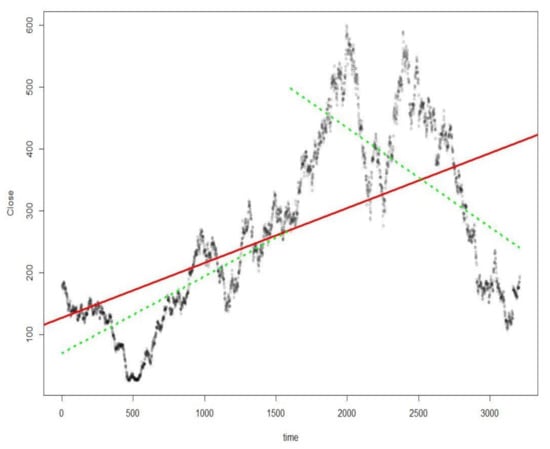 Structural breaks in the data lead to errors in forecasting; in this work, we have considered the structural breaks in the data while forecasting the volatility []. Chow test is used to test the structural break in the stock datasets. In this method, time-series datasets are split into two equal parts, then the coefficient of two linear fits are compared to know whether the structural break is present or not. Let us consider the linear regression equations in (2) and (3).