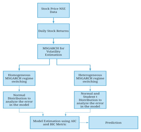 Structural changes in time series data are referred to as regime-switching. The overall proposed work is depicted in Figure 8. Regime switching is essential when there is higher volatility in stock prices. Therefore, we have applied a Markov Switching-based GARCH (MSGARCH) model to estimate the stock price volatility. In this work, we have considered two MSGARCH models to estimates the volatility in stock price. In the first model, we have used homogeneous MSGARCH regime-switching. In homogeneous MSGARCH, GARCH conditional variance is considered. The normal distribution is used to analyze the error distribution in the models.