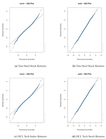 The experiments are carried out in R studio. We have used the MSGARCH R package developed by []. There were around 3259 data samples collected from the year 2007 to April 2021. The data are given as input to the proposed model. We have considered two MSGARCH models: the first is homogeneous MSGARCH, and the second is heterogeneous MSGARCH. The proposed model conditional distributions are verified by using the normal distribution and Student t distribution. We have found that Student t distribution performs better than the normal distribution, depicted in Figure 9. Therefore, in further work, we have considered Student t distribution instead of normal distribution. The performance of each model is estimated using the AIC and BIC metric, and it is defined below Equations (9) and (10). L represents the value of the likelihood function. The number of estimated parameters of the model is represented using P.