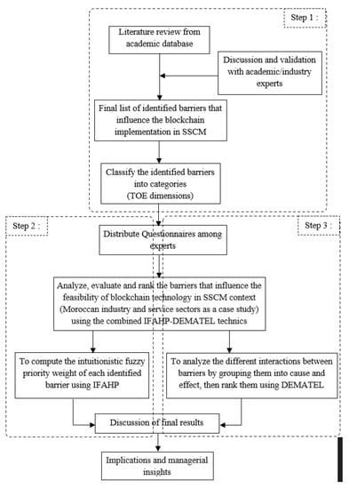 In essence, blockchain technology has lots of potential to introduce reconstitution in SSCM. As Moroccan SCMs and SSCMs have several limitations and are very complex, unorganized, and involve many intermediaries, they require an appropriate consolidation platform, where certain technologies, such as blockchain, could play a significant role. Indeed, as [] argued, developing countries can benefit from the important features of blockchain technology, such as helping with the disintermediation and decentralization of existing markets and modes of governance and business to enforce sustainability standards. The Moroccan strawberry supply chain, for example, has experienced potential improvement proposals [,]. One of the objectives of these proposals is to measure the challenges and opportunities of implementing blockchain technology, focusing on remote auditing during the 2020 harvest season []. Due to increased awareness, people demand more sustainable compliance. Hence, the adoption of blockchain technology has become imperative to guarantee such activities for real-world practices. Nevertheless, blockchain implementation is still in the naive stage []. Therefore, addressing the barriers that influence blockchain adoption in Moroccan SSCM is urgently needed. Currently, it is evident from the available literature review that no study has investigated the blockchain adoption barriers in SSCM by applying the fuzzy group decision-making framework based on IFAHP and DEMATEL, particularly in the Moroccan context. This paper makes contributions in this direction. The methodology followed and its application are briefly introduced in the following sections.