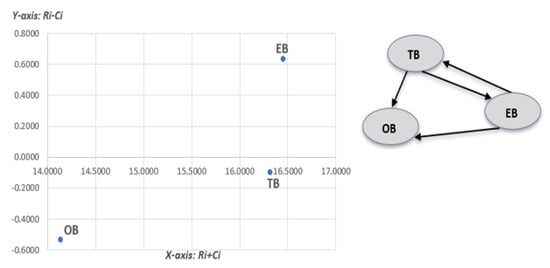 Let be the vector representing the sum of rows of matrix T and be the vector representing the sum of the columns. Using the values of and , a degree of influence and a degree of relationship with others is defined. In fact, the sum presents the total effects given and received by barrier i (the higher this sum, the stronger the relationship with the other barriers and vice versa), and the difference presents the net effect that barrier i contributes to the system. More precisely, barrier i is a net cause group (has higher influence on others) on the condition that the value of is positive, whereas factor i is a net receiver group (tends to be influenced more from others) if is negative.
