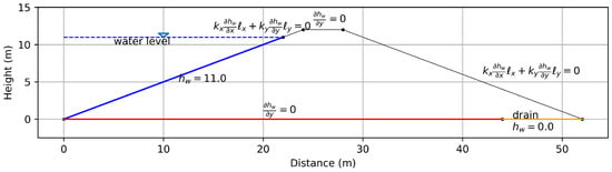The domain for the case study is a typical cross-section of a dam of 12 m height; it is shown in Figure 1 along with its boundary conditions. The dam is built of only one kind of soil; the water level is located at 11 m on the upstream side (). The dam bed is considered impervious except for a drain of 8 m of length placed on the downstream side, where the pore water pressure is set as equal to zero. The downstream boundary condition is also set to zero, with the intensity direction of the normal flux defined by the direction cosines , . The same case is presented in the upper part of the upstream boundary above the water level and at the top of the dam. It must be noted that in the case where the water level exceeds the downstream boundary height, the water pressure equals the atmospheric pressure, and then the boundary conditions must be corrected accordingly.