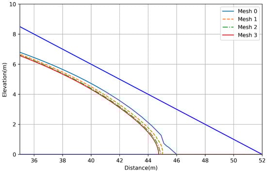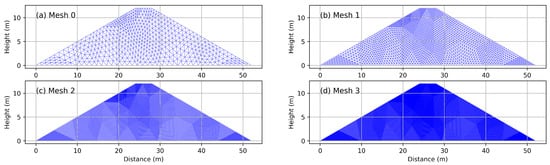 Following this procedure, grids with 3968, 15,872, and 63,488 triangles were generated (see Figure 2). Using this grids, Equation (10) was solved using the parameters described in Section 2.3.3. The phreatic line for the finest mesh (d) is shown in Figure 3. A more detailed view of the phreatic lines is displayed in Figure 4. The fast approximation of the consecutive phreatic lines to the one corresponding to the finest mesh can be seen, even though the meshes were not smoothed or preprocessed.