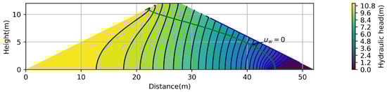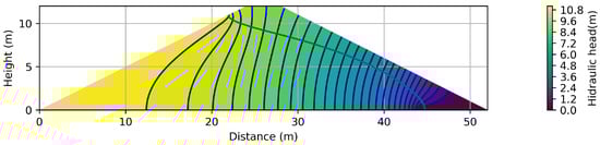 The soil parameters used in the tests are shown in Table 2. The finite element method solution in the refined mesh is shown in Figure 6, where the line at is the phreatic line. For the next analysis, it will be taken as a reference for the comparison of the different solutions presented.