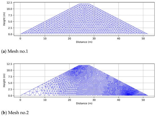Regarding the problem of interest, the modeling stationary flow in a dam was solved with two numerical methods: the generalized finite differences method described in the previous section and the finite element method using linear elements as a reference. Both of them were codified in Julia 1.5. Having the shape of the phreatic levels obtained in the previous subsection, two new different meshes were used in the numerical experiments: a rather coarse one (Figure 5a) and another with refinement in the zones where abrupt changes in (Figure 5b) are expected. The first mesh has 778 nodes and 4221 triangular elements with an approximate side length of 0.75 m. The refined mesh has 2559 nodes and 14,661 elements and was obtained from the coarse one by refining around the boundary sides where Dirichlet and Neumann boundary conditions meet.