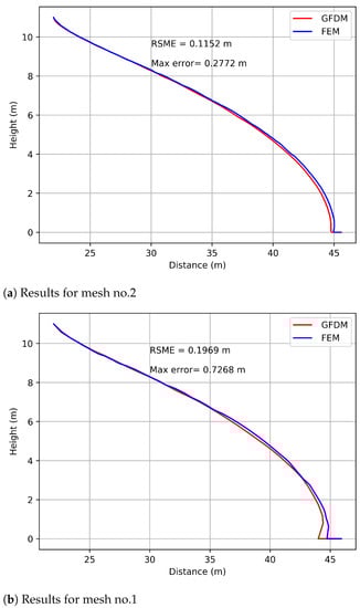 A zoomed in view of the solution near the drain zone can be seen in Figure 7; the high slope can be easily noticed. In a two-dimensional view, some additional remarkable details can be noted. In Figure 8a, the phreatic line obtained with both methods in the refined mesh is presented. The value of the area enclosed by the solutions is equal to 2.2396 m2 in the coarse mesh and the value of the RMSE is equal to 0.1152 m. However, if one looks at Figure 8a in detail, near the base there is a separation of the two calculated lines. The one in blue (FEM method) has a slight shift to the right, an effect that occurs due to the mesh, whereas the red line (GFDM method) is completely vertical. This suggests that the GFDM solution is smoother than the FEM solution near the base. To highlight the effect of the mesh mentioned above, in Figure 8b, the solution with the coarse mesh is shown. The separation of the two lines increases and this causes the RMSE error and enclosed areas to increment to 0.1969 and 2.2414 m2, respectively, due to abrupt movements of the blue line (FEM results) caused by the singularity at the boundary. As a reference, the maximum distance between the two lines is printed in the figures (max error), and it can be noted that, for coarse mesh, its value is 0.7268 m, and for the refined one, it is equal to 0.2772 m; these numbers confirm the observation mentioned above.