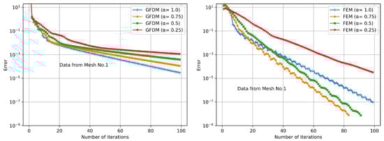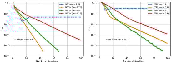 The analysis of the performance of the Newtonian iteration (13) provides some extra insight into the solution process. The semilogarithmic Figure 9 and Figure 10 present the convergence history for solving the problem on both grids; Figure 9 shows results on the coarse grid. Clearly, on the coarse grid, even when in both cases convergence is achieved, the FEM iteration shows a better performance. On the other hand, on the refined mesh, adapting the step size length under the Armijo rule was necessary to achieve convergence, the GFDM being notably faster in the latter case.