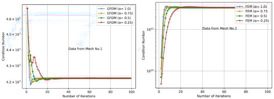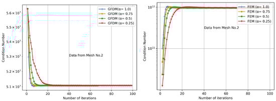 Additionally, Figure 11 and Figure 12 show the evolution of the Jacobian condition number on the iterations. In both cases, the condition numbers are relatively large, although the Jacobian on the FEM iteration is in a worse condition than in the case of the GFDM iteration even when the same Newtonian procedure is applied. Nevertheless, when the Armijo rule is applied, convergence was obtained in all the tests.