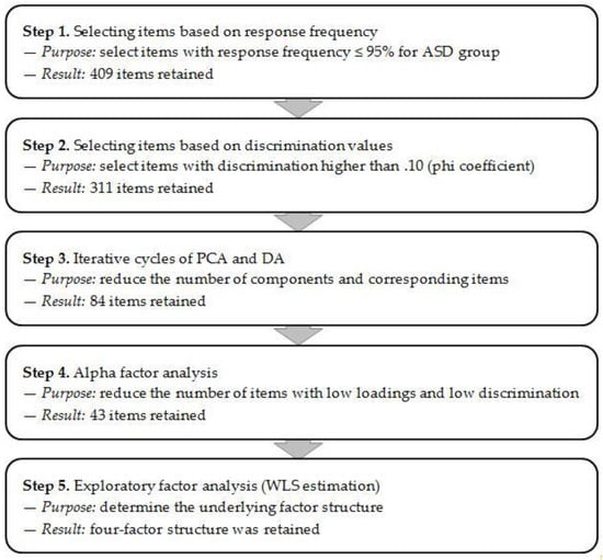 The main steps of preliminary data analysis are depicted in Figure 1. The purpose of this stage of the analysis was to identify a factor structure that meets the following requirements: (a) the factors provide high accuracy in identifying the ASD group; (b) each item is included in only one factor with a factor loading of at least |0.4|; (c) each factor includes a set of items that provide sufficiently high internal consistency reliability (Cronbach’s alpha is not lower than 0.7); (d) each factor has a distinct meaningful interpretation. Firstly, out of 434 items, we selected 409 for which any response option (yes/no) in the ASD group had a frequency of less than 95%. Then, for each item, the discrimination value was calculated as the absolute value of the phi coefficient of this item and the grouping variable ASD/non-ASD. Three hundred and eleven items with a phi coefficient of at least 0.11 (p < 0.05) were selected. To further reduce the number of items, we used Principal Component Analysis (PCA) with equamax rotation and Kaiser normalization. The calculated components served as independent variables for Discriminant analysis (DA); the grouping variable was ASD/non-ASD. The step-by-step procedure of DA was used, with p = 0.05 for F-deletion and p = 0.1 for F-inclusion. At the first step, we used a threshold eigenvalue greater than one and identified 80 components that explained 78% of the total variance. According to DA results, 48 components were excluded. For the next step, 32 components and 219 items were specified. These steps (PCA–DA cycle) were repeated until 12 components with 190 items were left. After that, all items having at least one component loading higher than |0.4| were retained, resulting in 170 items in total. According to the scree plot of eigenvalues after PCA of 170 items, the “break” point was observed at the fifth eigenvalue. Therefore, in the next step, six components were set, which were calculated after the rotation. DA showed that five components were at F-removal p < 0.001, and the sixth one, which explained the maximum variance, was at F-removal p = 0.015. Furthermore, for the sixth component, the standardized coefficient of the discriminant function was 2.5–3 times less than for the other components. Although this component included 64 items with loadings higher than 0.4, 56 of them were excluded due to low discriminative coefficients (≤0.35). For the remaining 114 items, an alpha factor analysis was applied with the assignment of five factors and equamax rotation. After that, all items not included in any factor with the loading of at least |0.35| were removed, leaving 102 items. Four out of five factors encompassed items similar in meaning and had a fairly clear interpretation. From the factor with an unclear interpretation, 18 items with discrimination lower than 0.35 were removed. Regarding the remaining 84 items, the alpha factor analysis with equamax rotation and number of factors fixed to four was repeatedly applied, followed by the removal of items according to the following criteria: (1) items are included in the most informative factor but have lower discrimination than items included in this factor with loadings of at least |0.4|; (2) items are “not similar” in meaning to other items included in this factor. Combining these criteria, we obtained a four-factor structure with 43 items.