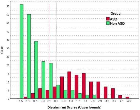 DA was applied to determine the effectiveness of ASD/non-ASD classification based on four subscales (S1–S4) and child’s age (in days). Age was included in the analysis to test the assumption that it can influence group membership, as we found earlier in the classification of healthy controls and DD groups [26,27,28]. The stepwise method was used to check the relative contribution of independent variables and to determine the significance level of F-to-enter/remove for each of these variables. At the fourth step of the analysis, the program included all four subscales with a significance of F-to-remove no more than 0.05 and excluded age with a significance of F-to-enter equal to 0.907. The standardized coefficients of the discriminant function are given in Table 5 (the centroid of the function for the ASD group is at the positive pole, while for the non-ASD group, it is at the negative pole).