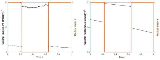 The insurance company collects premiums from selling insurance contracts and buys reinsurance contracts to share the risk that it may not be able to carry. Since the claim arrival intensity is affected by the stochastic factor Y, following for instance [6], we assume that both the claim premium rate and the reinsurance premium are subject to different regimes. Precisely, the insurance gross premium is of the form , for every , where is a continuous function in , for all . We consider reinsurance contracts of proportional type, with protection level , i.e., at any time , represents the percentage of losses which are covered by the reinsurer. The insurance company pays to the reinsurer a premium at rate , for some function , which is jointly continuous with respect to , for every , with .