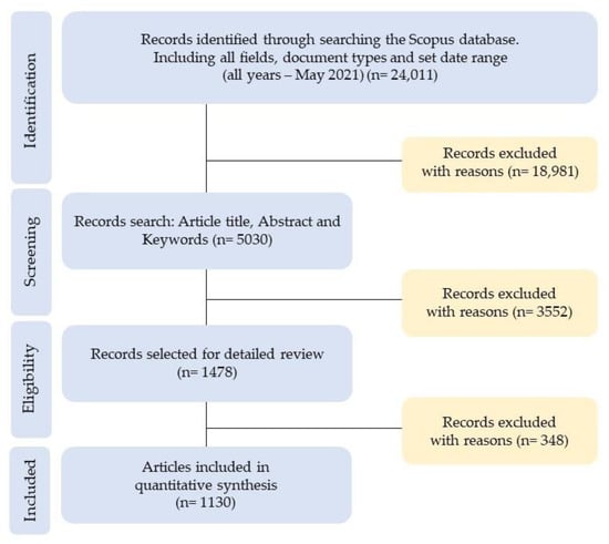 Currently, bibliographic databases provide the quality and validity of an analysis of any scientific field. Numerous works, to analyze the most appropriate scientific database, in terms of comparison and stability of the statistics, to be used in bibliometric studies, have focused on Web of Science (WoS) and Scopus. The conclusions of these studies indicate the use of a database will depend fundamentally on the (i) focus of the analysis; (ii) discipline; and (iii) the time horizon of the study [57]. The two databases were studied and considering the same study variables, the volume of records in WoS (Core Collection) (190) was lower than in Scopus (1130); therefore, Elsevier’s Scopus database was used.