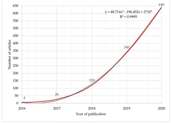 This section seeks to provide an answer to RQ1: What has been the evolution of scientific production in this field of knowledge between 2016 and 2020? Figure 2 shows how the number of articles published between 2016 and 2020 about BC technology for secure accounting management has evolved worldwide. The trend in the publication of documents is polynomial of order 2, it follows a mathematical function of the form: y = 48.714x2 − 196.452x + 2 × 108. The trend line indicates that the number of articles on this topic is increasing faster over time. Furthermore, this line shows its goodness of fit with a coefficient of determination, R2, equal to 0.9995, which denotes the proportion of the variance in the dependent variable (number of articles) that is predictable from the independent variable (year of publication).