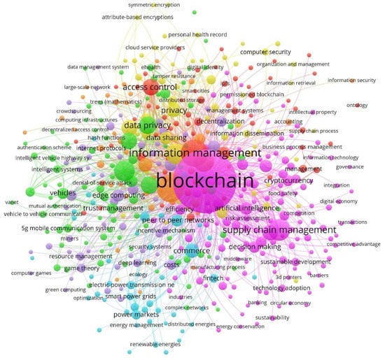 This section seeks to respond to RQ2: What were the main lines of research studied in the 2016–2020 period? In the 1130 scientific articles analyzed (2016–2020), 23,017 keywords were identified, highlighting: Blockchain (in 942 documents), information management (174), Internet of Things (171), supply chain management (108), digital storage (107), network security (99), smart contract (98), data privacy (72), security (71); or access control (66). These keywords are linked to search terms or research variables, which were identified in the initial literature review (see Table 1). The variable “Blockchain” refers to the chain of blocks that contain encoded information of a transaction on the network; “Accounting” to the discipline of economics that functions as a control/recording system of expenses/income and other economic operations carried out by an entity; and “Management” to the action of administering, organizing, and making a certain economic activity function.