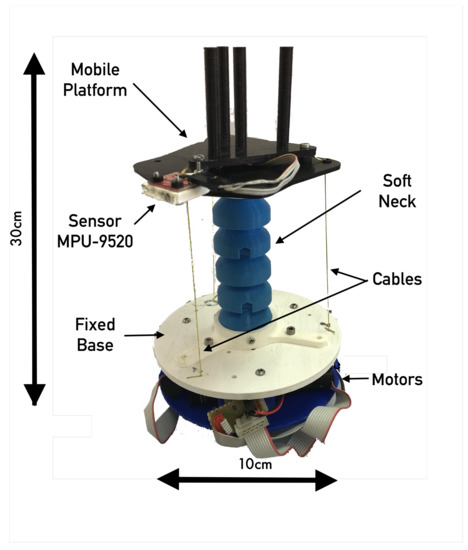 The neck is composed of a base, a mobile platform, a central soft link, tendons (cables), and motors, as shown in Figure 1. All parts were built using a 3D printer, including the soft link, which weighs (excluding motors and hardware).