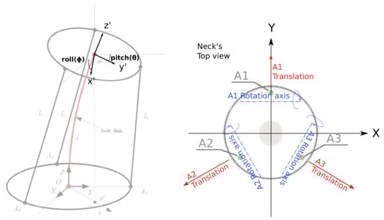 According to [29,30], the soft neck is a hyper-redundant robot. Therefore, the term degrees of freedom (DOF) is not applicable in the usual sense. Nevertheless, there is a connection between the three tendon lengths and the neck’s final angular position.