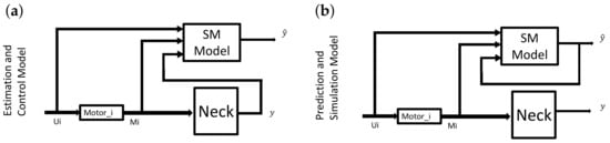 where is the desired motor position for motor i at sample k, is the measured motor position at discrete time k, and y is the measured output at sample k when an estimator and control model is generated. Therefore, if noise or disturbances are detected in the measured output, the model aligns its dynamics using this information with the true model dynamics. On the other hand, if the required model is generated for prediction and simulation, the signal in (22) will be replaced by the previous model estimations at time . In this case, errors and disturbances detected at the output will not be perceived by the model unless a closed-loop control action modifies the input components of the regressor. In this case, if the model diverges from the real dynamics, they will not align with each other. The model architectures are given in Figure 3.