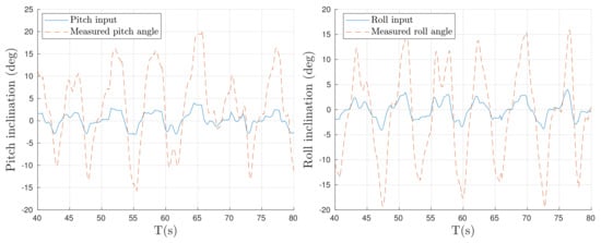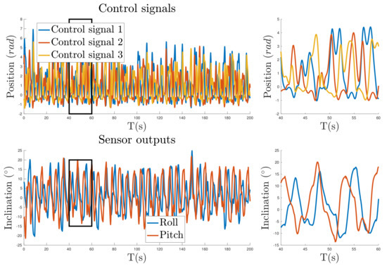 There exists low-level control managed by the motors’ drivers, which satisfies all the platform’s needs. For this reason, all system data are captured as an open-loop plan, with the actuator position and velocity as input and the inclinations roll and pitch as output.