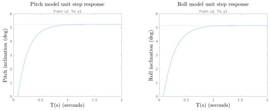 The model unit input time responses are shown in Figure 6 for the described system model. Note how both systems’ (, (s)) static gains are close to 5, showing a stationary response above the unit input level, as expected from Figure 5.