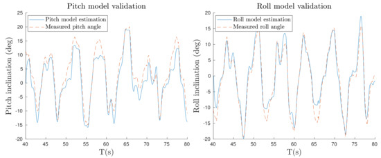 Once the linear models of the soft neck decoupled system are determined, a new input response simulation was performed using those models, together with a new data set for validation and accuracy check. A partial plot of these results is shown in Figure 7 for the pitch and roll angles.