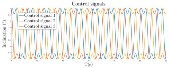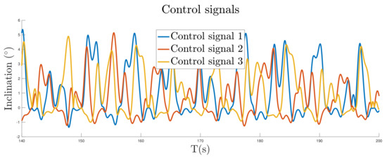 As it can be seen, the different signals are non-linear and have different frequencies and phases. This provides a pseudo-random interaction and covers a wide range of operational modes of the neck. The frequency spectrum that was chosen is coherent with the system bandwidth, which is , generating soft, continuous, and human-like motion in the axes of interest. By modifying the phase and mixing the minimum and maximum frequencies, we aim to explore in a single experiment a wide range of motions providing sufficient information for the FSS. However, it is necessary to point out that some system dynamics did not occur during the proposed study scenario, such as the three tendons pulling at the same time with the same force, which keeps a static neck position with different stiffness, as well as continuous single tendon activation, to name some. Even if the proposed FSS does not cover the full system dynamics, the chosen signal should cover the normal operational range for the soft neck.