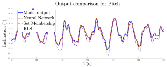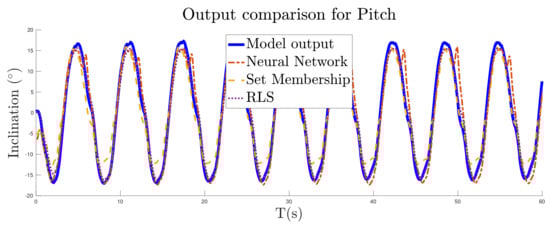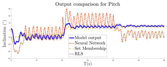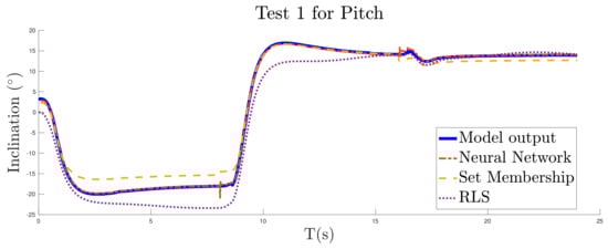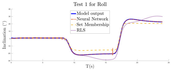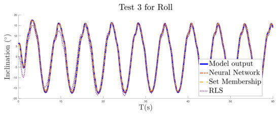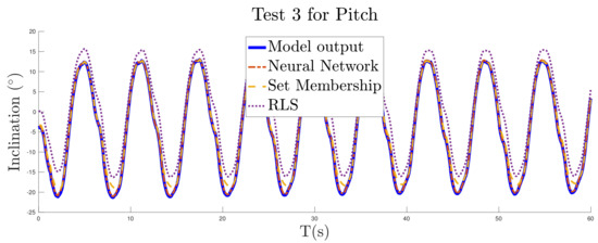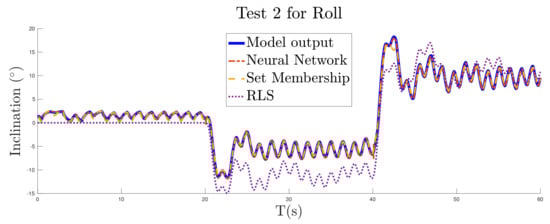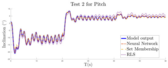 The Set Membership followed the output of the system closer than in the previous test. It scored 93.0012% for pitch and 93.8389% for roll, much closer to the validation results. It is important to mention that the SM follows the dynamics and does not have the bias error observed in Test 1. Therefore, the FSS properly captures the continuous dynamic behavior, but it requires additional information to capture static behaviors, as required in Test 1. This is true also for the NN model, which also improved. It scored 98.1058% in pitch and 98.3087% in roll. The RLS roll output shows the disadvantages of this model. Due to the decoupling of the signal, while the initial movement causes little movement on the roll axis, RLS cannot process them and scores a worse fit than in the rest of the test. The fit scores are 78.4813% in pitch and 48.5090% in roll.