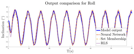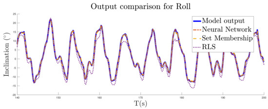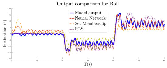 Set membership scored 87.6260% in the NRMSE test for pitch and 79.3195% for roll. NN followed the output better and scored 97.9574% for pitch and 98.5654% for roll. The SM response did not settle at the appropriated inclination, lagging out before the maximum inclinations were reached. As can be seen, the model does not reach the negative inclinations properly. However, in Figure 12, the dynamics for negative and positive inclinations are followed as desired. It is seen that the existing bias in the time windows follows the output dynamics. In the roll axis case, the same bias appears with the negative inclination angles, while in the positive case, it stabilizes at time in the final value. However, it does not properly capture that dynamic, neither. The maximum errors for the NN appear at 8 and 16 seconds, when the signal is changed from one tendon to the next; this is probably due to a lack of information in the data set. Meanwhile, RLS scored 79.9230% in pitch and 76.0284% in roll. This can be due to the fact that the initial conditions do not match the real model ones.