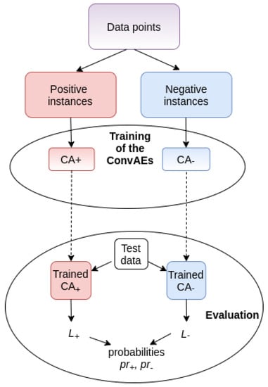 Considering the notations from Section 3.1, the classification problem is formalized as the approximation of two target functions (i.e., one target function for each class) t c : R + R [ 0 ,   1 ] ( c { + , } ) that express the probability of instances from R + R to belong to the “+” or “−” classes. Thus, the learning goal of A u t o N o w P will be to approximate the functions t + and t . A u t o N o w P consists of two ConvAEs, one for the “+” class ( C A + ) and one for the “−” class ( C A ). For training an autoencoder C A c ( c { + , } 47 % from the data set R c (i.e., 70 % from the data not used for testing) will be used for training, 20 % for the model validation and the rest of 33 % from R c will be further used for testing, using a 3-fold cross-validation testing methodology.