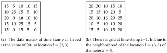 In our previous works [11,26] we highlighted that similar values for the radar products in a specific location l at a time t are encoded in similar neighborhoods of the location l at time t−1. For a specific location l at time t, a d 2 –dimensional vector containing the values of a radar product R p from the sub-grid of diameter d centered on l (at time t−1) will be assigned. The d 2 —dimensional instance will be labeled with the of R p for the location l at time t [11]. A sample data grid containing the values for the product R01 at time t is shown in Figure 2a, while Figure 2b depicts the data grid at time t−1.
