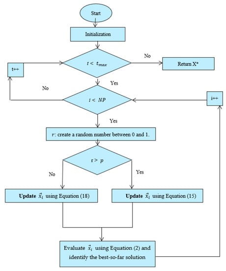 Regarding modification to the mathematical model at this stage—our idea was based on designing one using two various schemes that are exchanged using a probability of 0.5 to involve balance between them. The first one searches around the current position scaled according to the current iteration, to promote the searchability of the algorithm within the search space, to avoid being stuck in local minima. The second searches around the best-so-far solution, and is also scaled according to the current iteration to improve the exploitation operator, to accelerate the convergence speed in the right direction of the near-optimal solution.