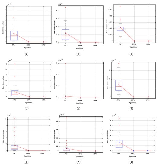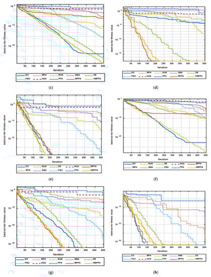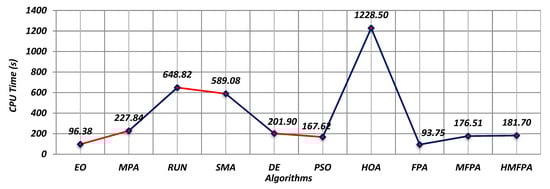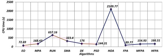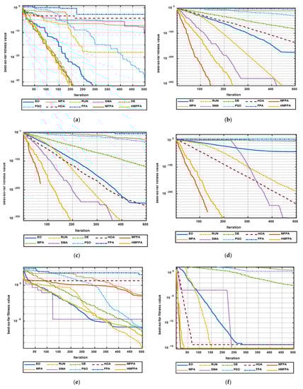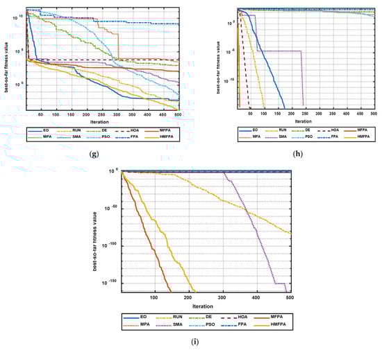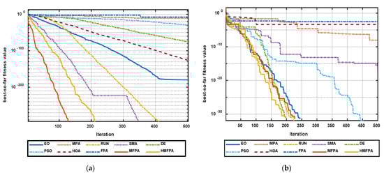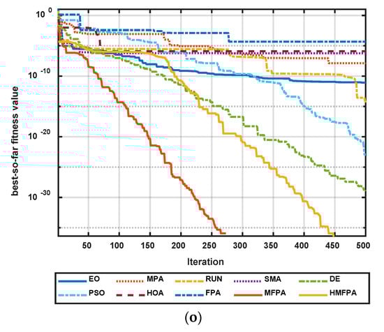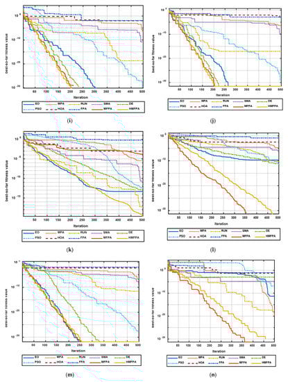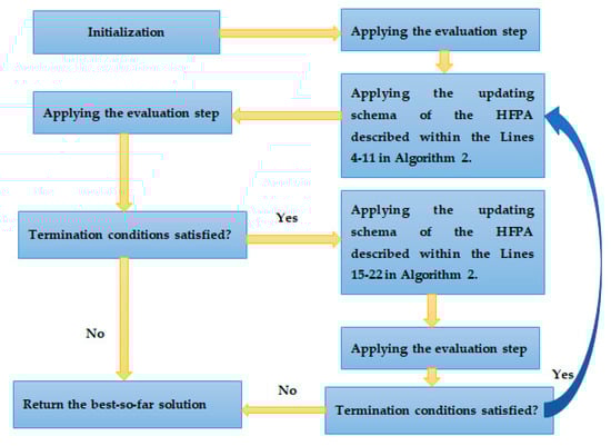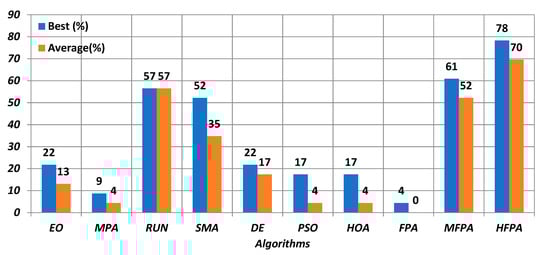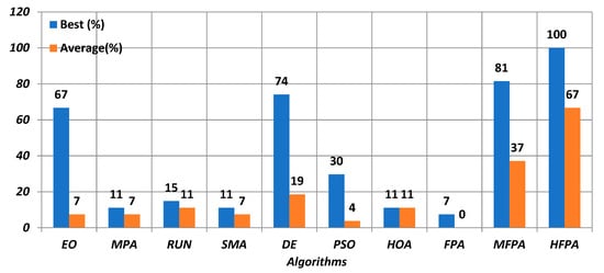 Therefore, a well-established evolutionary algorithm known as differential evolution (DE) has been successfully applied to tackling several optimization problems, either continuous or discrete ones, and enjoyed with various updating schemes. One of those schemes, having a high ability for the exploration, is “DE/rand/1”, which explores the regions around one selected randomly from the population []. There are several DE variants based on various updating schemes or hybridization between DE, and some effective techniques have been extensively applied to tackle global optimization [,,,,,,,,,,]. Since our proposed, MFPA suffers from a problem in the exploration operator, and the DE’s updating scheme “DE/rand/1”, have more direction to the exploration operator than the exploitation. DE is integrated with MFPA to propose a new variant called HFPA, balancing between the exploration and exploitation for preserving the population diversity to avoid being stuck into the local minima, and moving accurately toward the best-so-far solution to reduce the time-consuming fitness function evaluations. After validation and comparison on 23 well-known unimodal and multimodal test functions, HFPA has superior outcomes compared to the rival algorithms, with success rates reaching 78% and 70% in best and average cases, also outperforming MFPA, which has percentages of 61% and 52% as the second-best one.