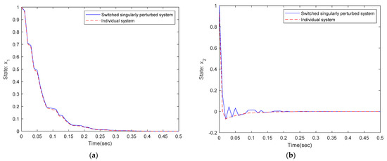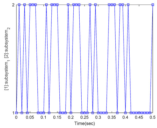 The trajectories for states of the switched singularly perturbed system (30) and its slow-fast system (31) during are shown in Figure 2a,b with initial value . The corresponding switching signal is shown in Figure 3. The solid line is the state of switched singularly perturbed system (30) and the dotted line is the state of the individual system.