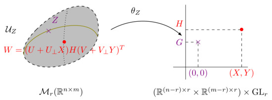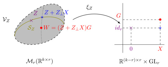 Therefore, we start in Section 2 by introducing a geometric description of . A classical approach consists of describing as the quotient manifold of equivalent classes of full-rank matrices Z in with the same column space . Here, we avoid the use of equivalent classes and provide an explicit description of an atlas for , with local chart