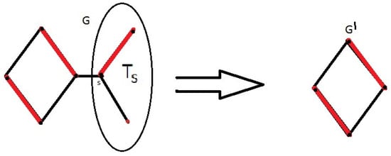 Consider an arbitrary packing . Assume that, in the graph there is a preterminal vertex s without a pair among the terminal vertices in That is, , where (Figure 1). We take an arbitrary edge if s is connected to another non-terminal edge r in we replace the link with a new link . The new packing will be denoted by . It is important that |. We perform the same procedure for all such vertices finally obtaining a packing with the property (2). □