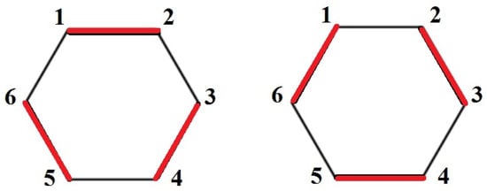 Now let and be cycle graphs of some length not representing a multiple of 3. Then in both cases, Some vertex is not included in any packing, and each vertex is not included in some packing. According to Lemma 8, , which contradicts the effectiveness condition . Hence, the core is empty (see Figure 9).