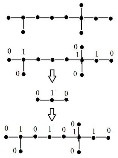 Using mathematical induction, we will demonstrate that the core of the tree is non-empty. Obviously, the core of the trivial graph i is non-empty (equal to 0). The core of the graph is also non-empty: it coincides with the straight-line segment connecting the points and . Assume that for all trees with at most k vertices, the core is non-empty. Let be a tree with vertices. There are pendant vertices in G. Removing any of the pendant vertices t and the adjacent one s, we pass to the graph , which is a tree or a forest. According to Lemma 7, the conclusions about the existence of the core in G and are the same. By the induction hypothesis, the core of is non-empty. Hence, the core of G is non-empty as well. We can easily describe the procedure for finding a point from the core. If is a pendant vertex, and is the adjacent vertex for t, then we pass to the graph , letting , , and so forth. If the graph splits into connected components, we apply this procedure for each component separately. See Figure 10.