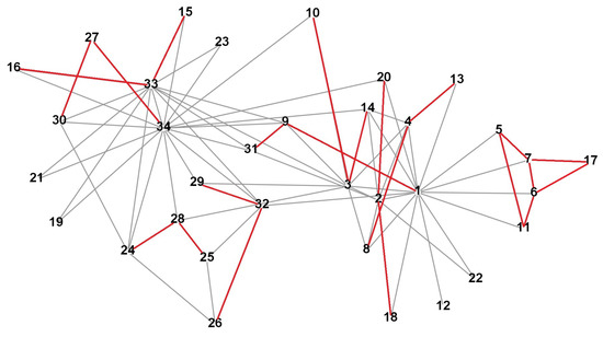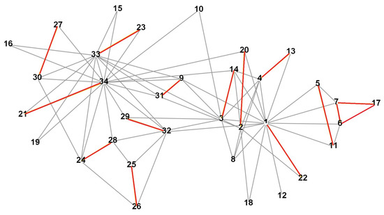 Consider the packing game for the well-known Zachary’s karate club network [21]. The graph of this network (Figure 14) describes the relations among 34 karate club members. There are 77 edges in total. The principal persons of the network are vertices 1 and 34.