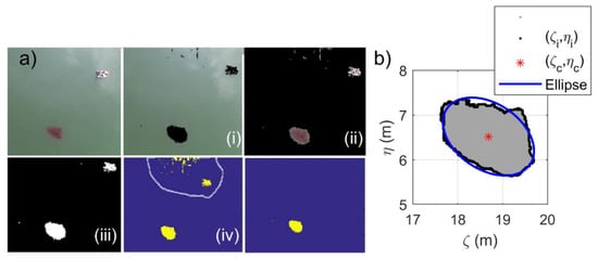 In Figure 3a, the scheme of the image treatment, which consists of the selection of (i) the RGB (red, green, and blue) intensity, (ii) the inverted mask image, (iii) the binary image, and (iv) the selection only of the dye patch, is shown. After georeferencing the image and calculating the geometrical center and the optimal axes, in Figure 3b, the binary image with the boundary dataset of the dye tracer patch, along with the optimal ellipse fit, is shown.